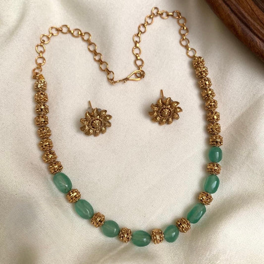 Gold-Toned Floral Stud-Mint Stone Necklace 1383