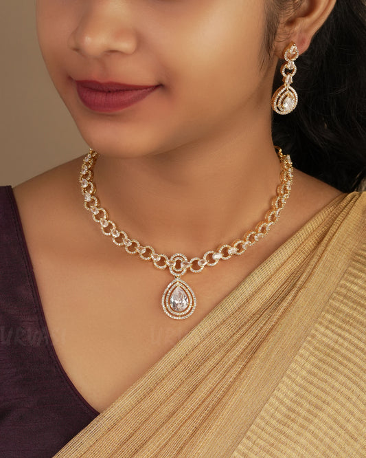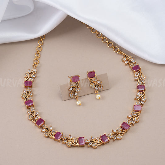 Gold-Polish Leaf Design AD Stone Necklace 251