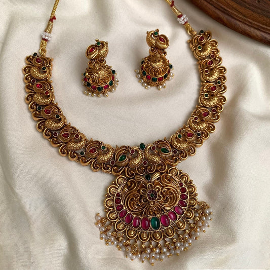 Gold-Toned Peacock Pushpa Pearl Beaded Necklace 1413