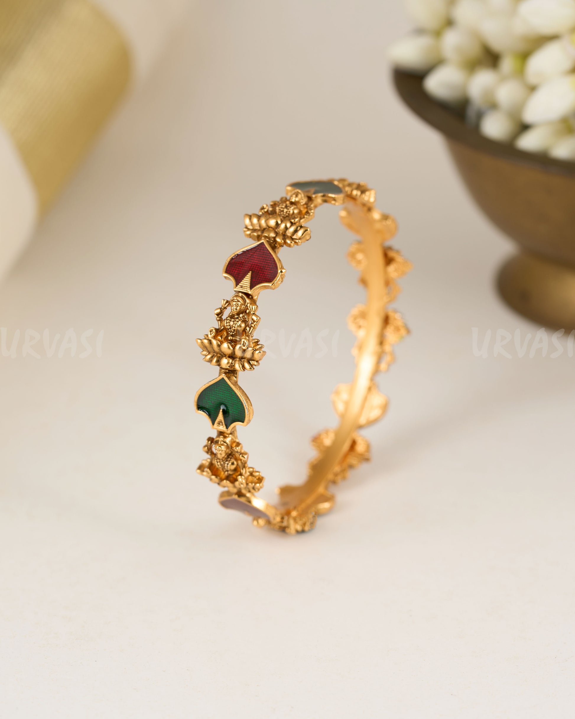 A Lakshmi Palakka Bangle is a kind of temple / traditional jewellery bangle from South India (especially Kerala / Tamil Nadu styles) that integrates motifs of Goddess Lakshmi and the “palakka” design elements (often enamel/glass “palakka” stones or colored work) into its structure.