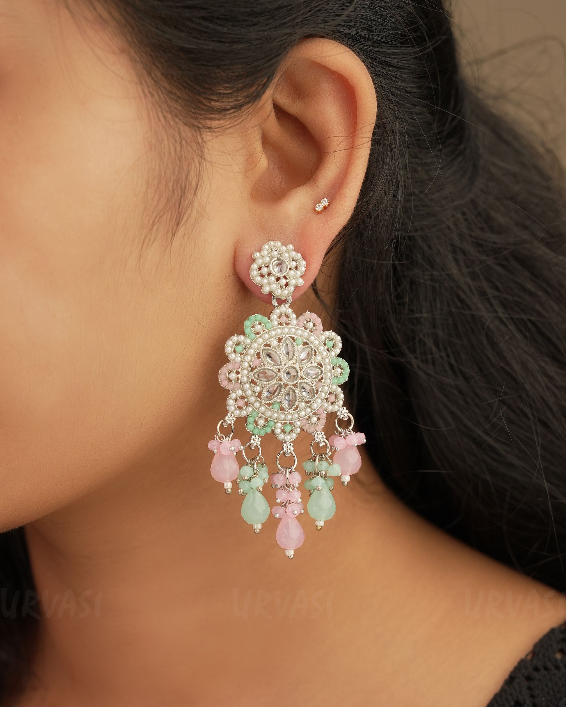 Delicate, colorful, and full of charm — these Rhodium Polish Reverse AD Dangle Earrings feature a soft blend of pink and mint pearl ghungroos, hanging gracefully below sparkling reverse-set American Diamonds. The high-shine rhodium finish adds a modern touch to this traditional silhouette, making them perfect for festive or everyday ethnic wear.