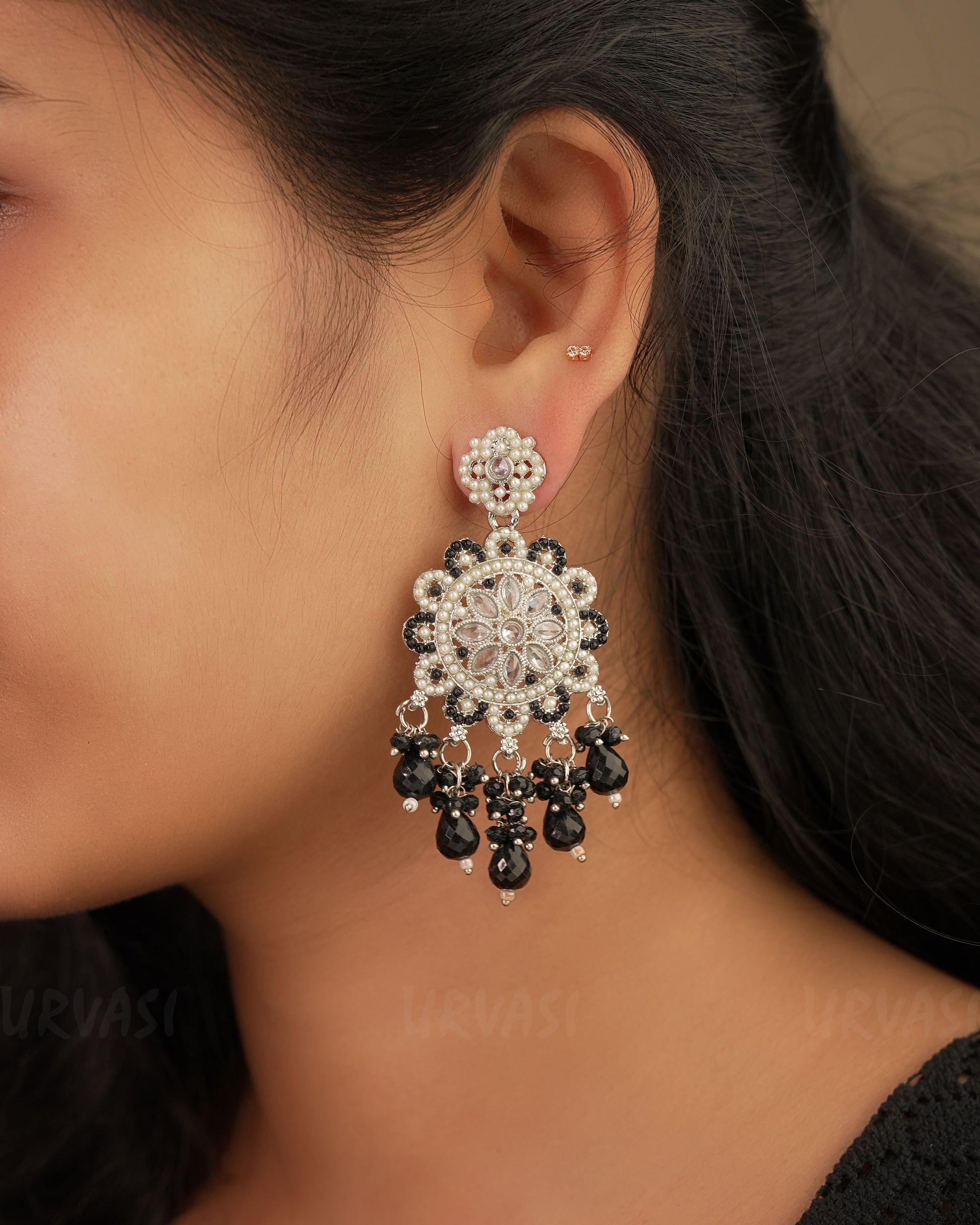 Striking and sophisticated, these Rhodium Polish Reverse AD Dangle Earrings feature dazzling reverse-set American Diamonds paired with elegant black pearl ghungroos. Set in a sleek rhodium finish, the contrast of sparkle and deep black pearls gives these earrings a modern, edgy appeal while still holding onto a touch of traditional charm.Designed without a second stud, these single-piece dangles are perfect for those who love minimal yet bold jewelry.