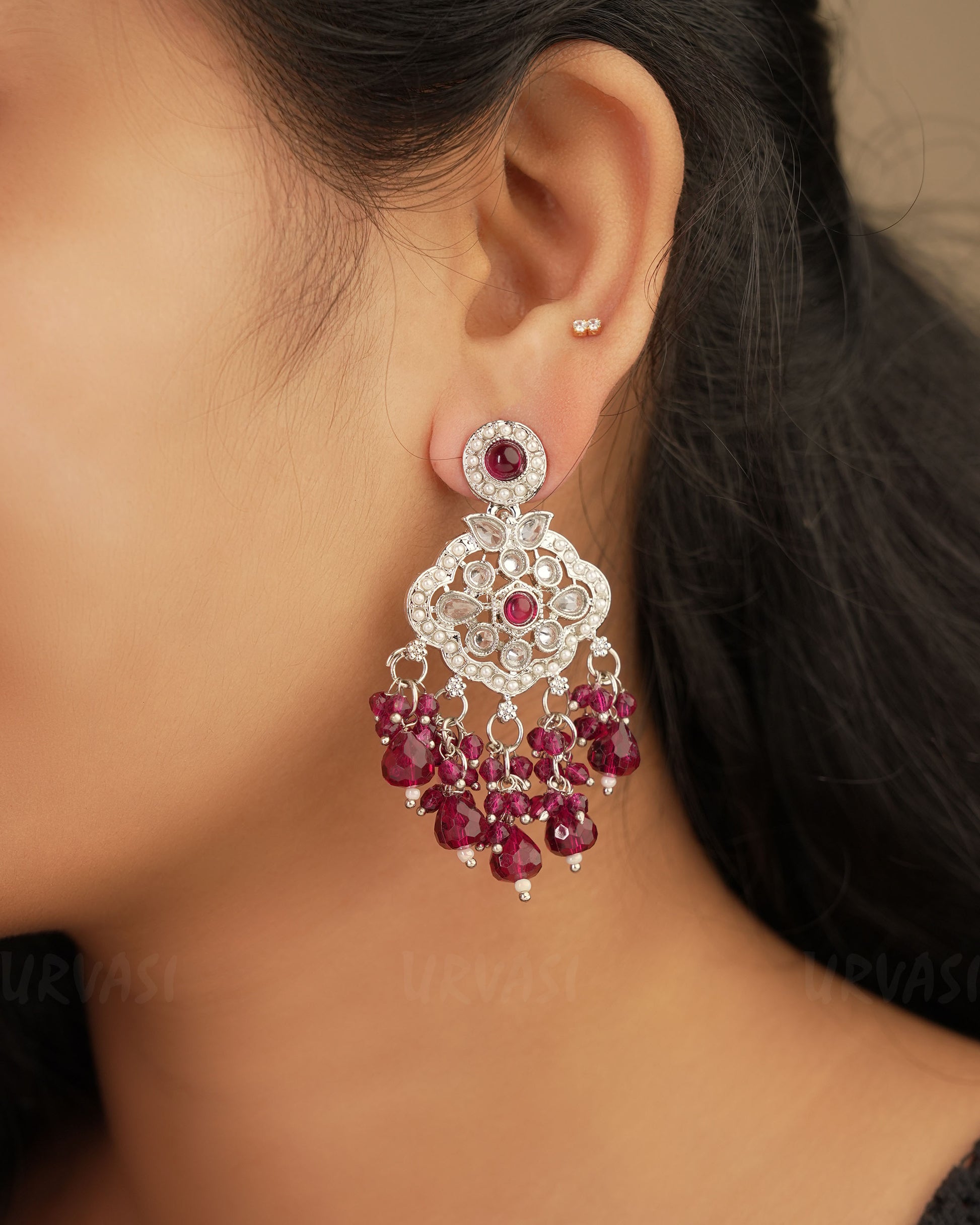 Bold, luxurious, and timeless — these Rhodium Polish Reverse AD Dangle Earrings feature sparkling reverse-set American Diamonds paired with deep wine-colored pearl ghungroos, making them a standout piece for your festive collection. The sleek rhodium finish enhances the richness of the wine hue, creating a perfect blend of modern glam and traditional charm.Designed as a single-piece dangle without a second stud, they bring just the right amount of drama and elegance to your ethnic or Indo-western outfits.