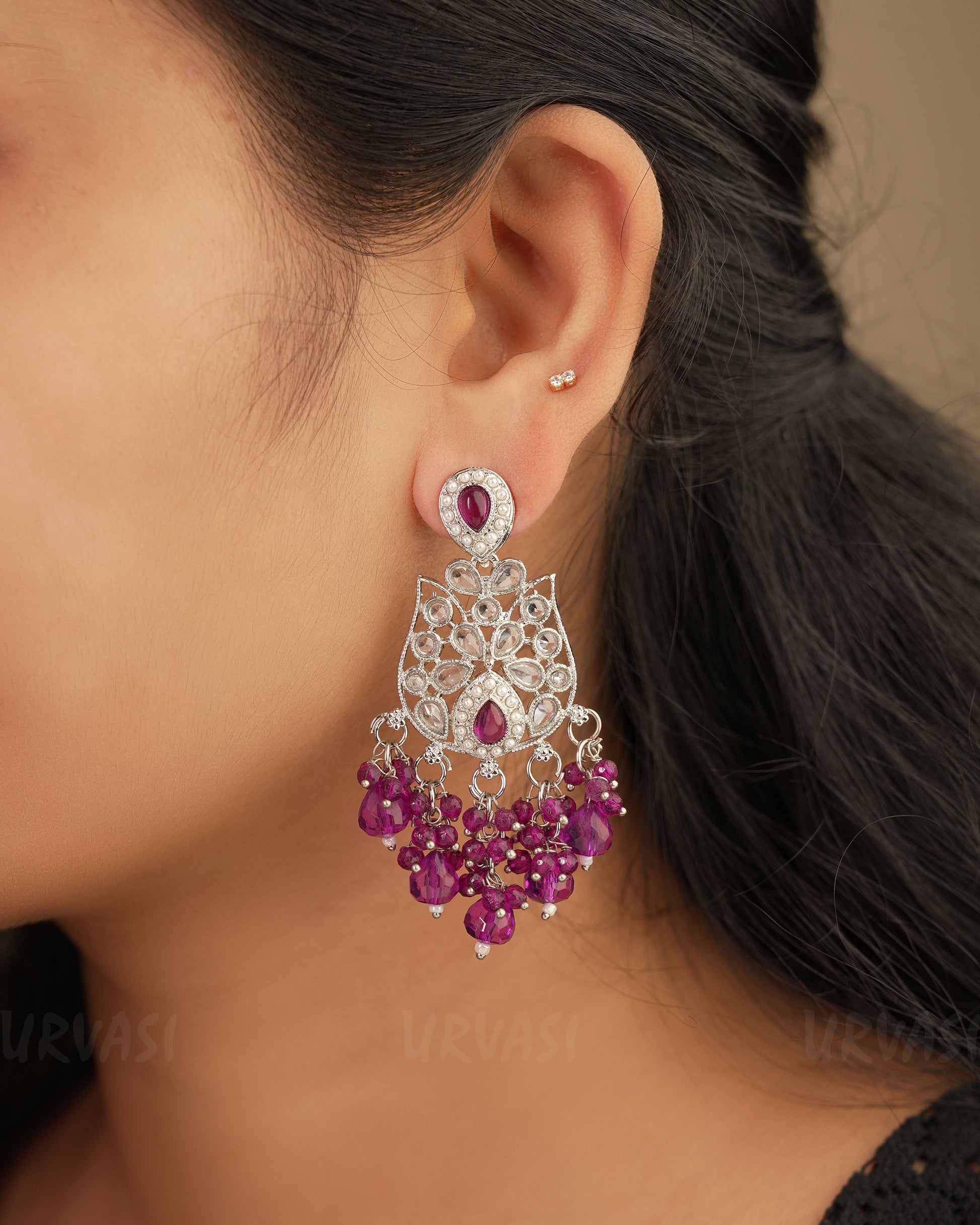 Add a touch of sophistication to your look with these Rhodium Polish Earrings featuring Reverse AD detailing and a graceful pearl dangle. Accented with a vibrant violet stone at the center, these earrings beautifully blend sparkle and elegance. The high-quality rhodium finish ensures a sleek, polished look with lasting shine. Designed as a complete pair without any additional studs, they're perfect for both everyday wear and special occasions
