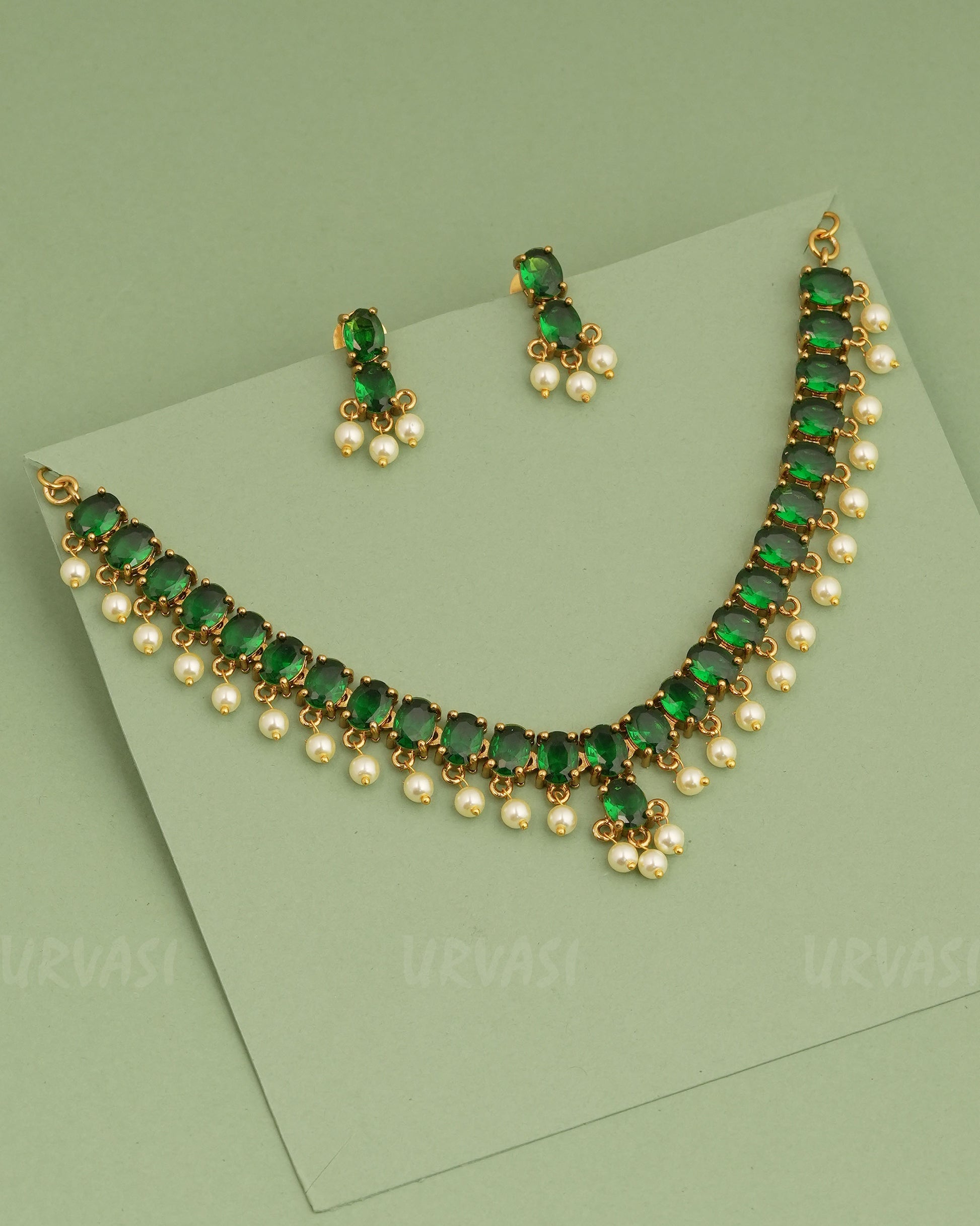 Elevate your elegance with our Gold-Polish AD Pearl Necklace, a perfect blend of classic charm and modern sparkle. Featuring luminous pearls delicately accented with shimmering American Diamonds (AD), this necklace is crafted to add effortless sophistication to any look.