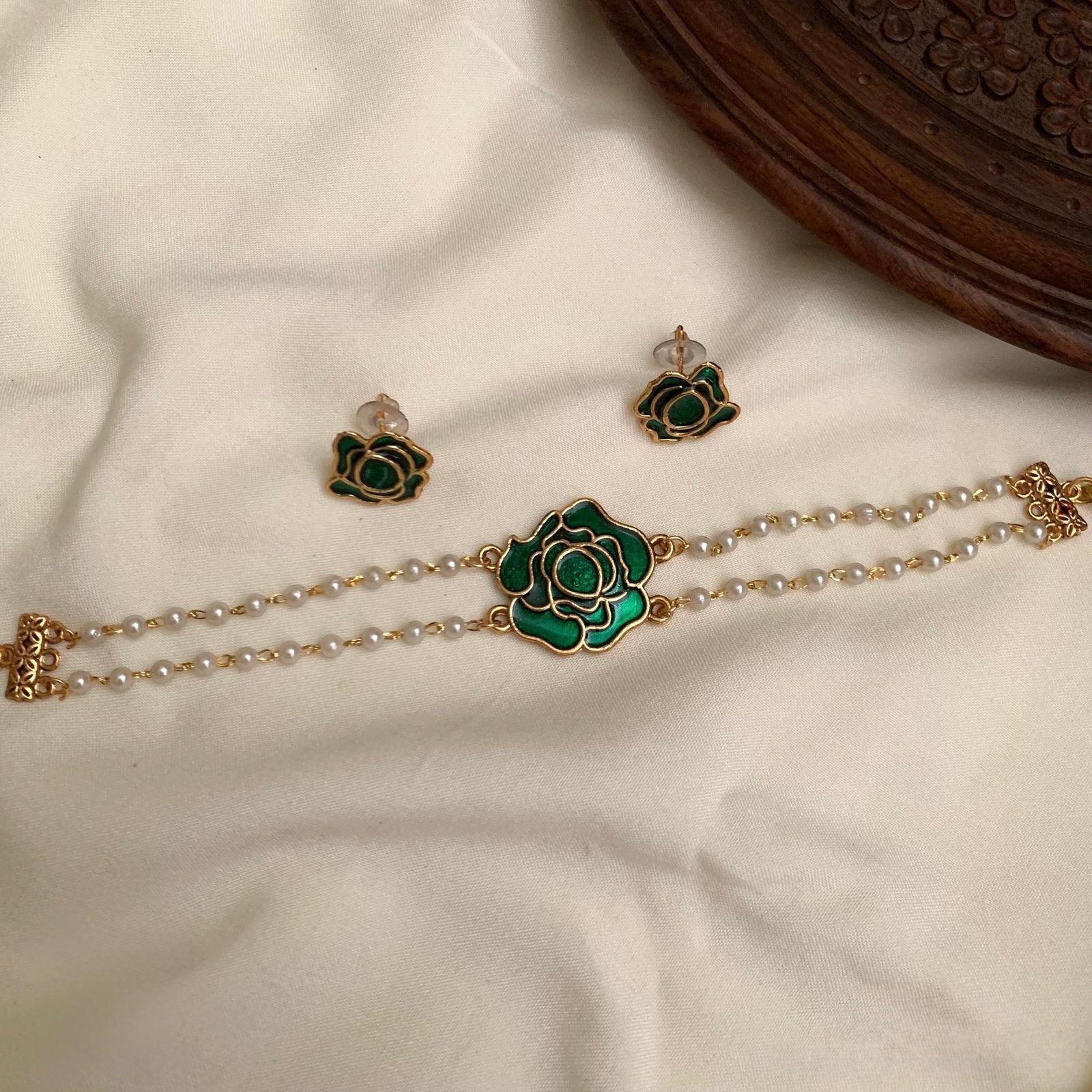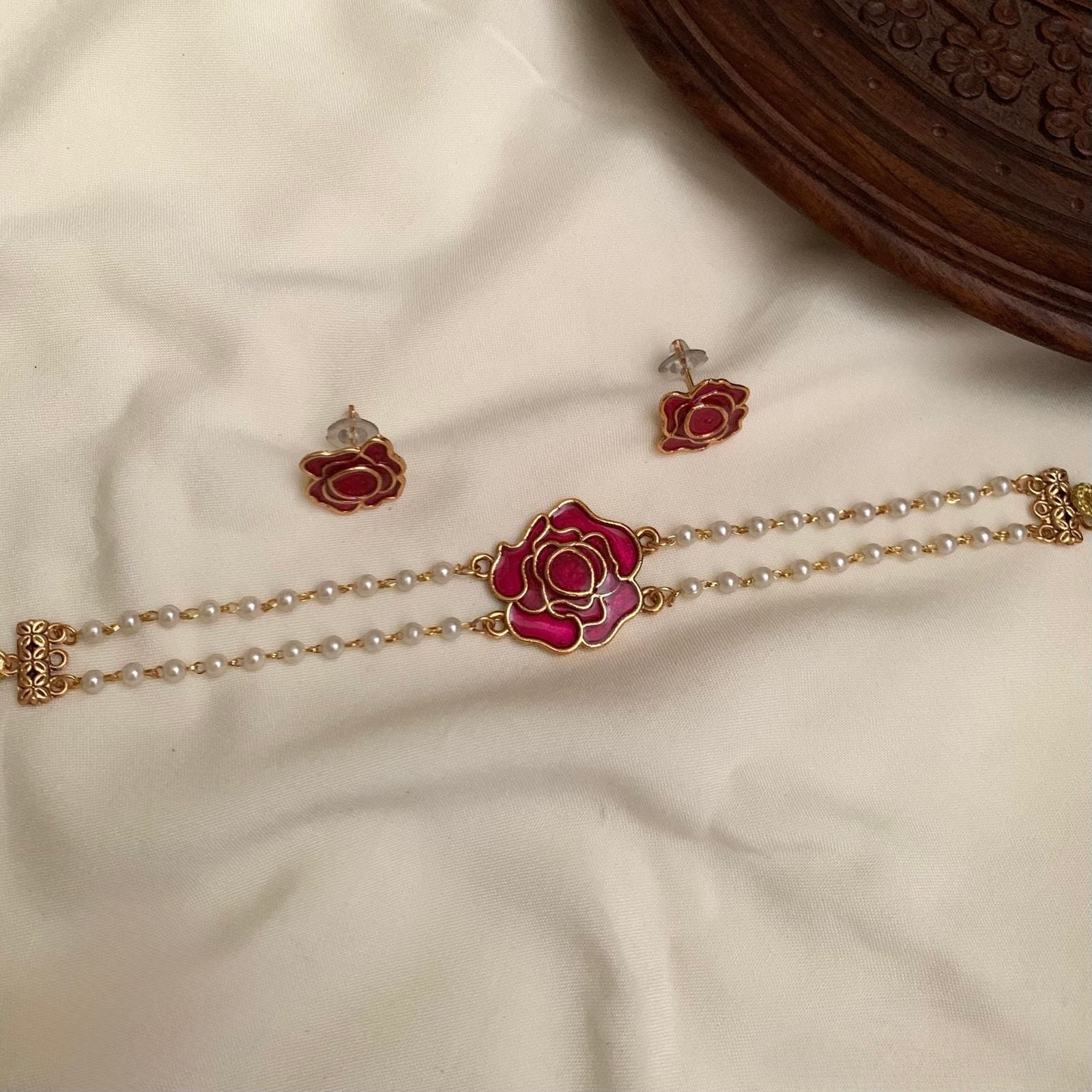 Embrace timeless beauty with our Gold-Polish Rose Pendant Pearl Choker Necklace. The centerpiece features an intricately crafted rose pendant finished in premium gold polish, symbolizing grace and femininity. It rests beautifully against a strand of lustrous pearls, creating a perfect blend of traditional charm and modern refinement. Lightweight yet striking, this choker is ideal for weddings, festive celebrations, and elegant evenings out.