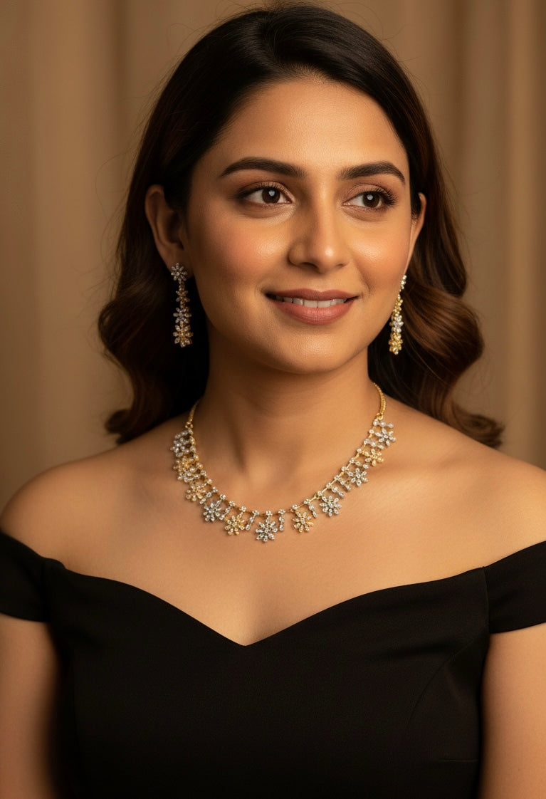 Exuding old-world charm with a touch of modern brilliance, the Gold-Toned Floral Victorian AD Necklace is a graceful statement piece inspired by classic Victorian elegance. Designed with intricate floral motifs and embellished with sparkling American Diamonds (AD), this necklace captures timeless sophistication and refined craftsmanship.