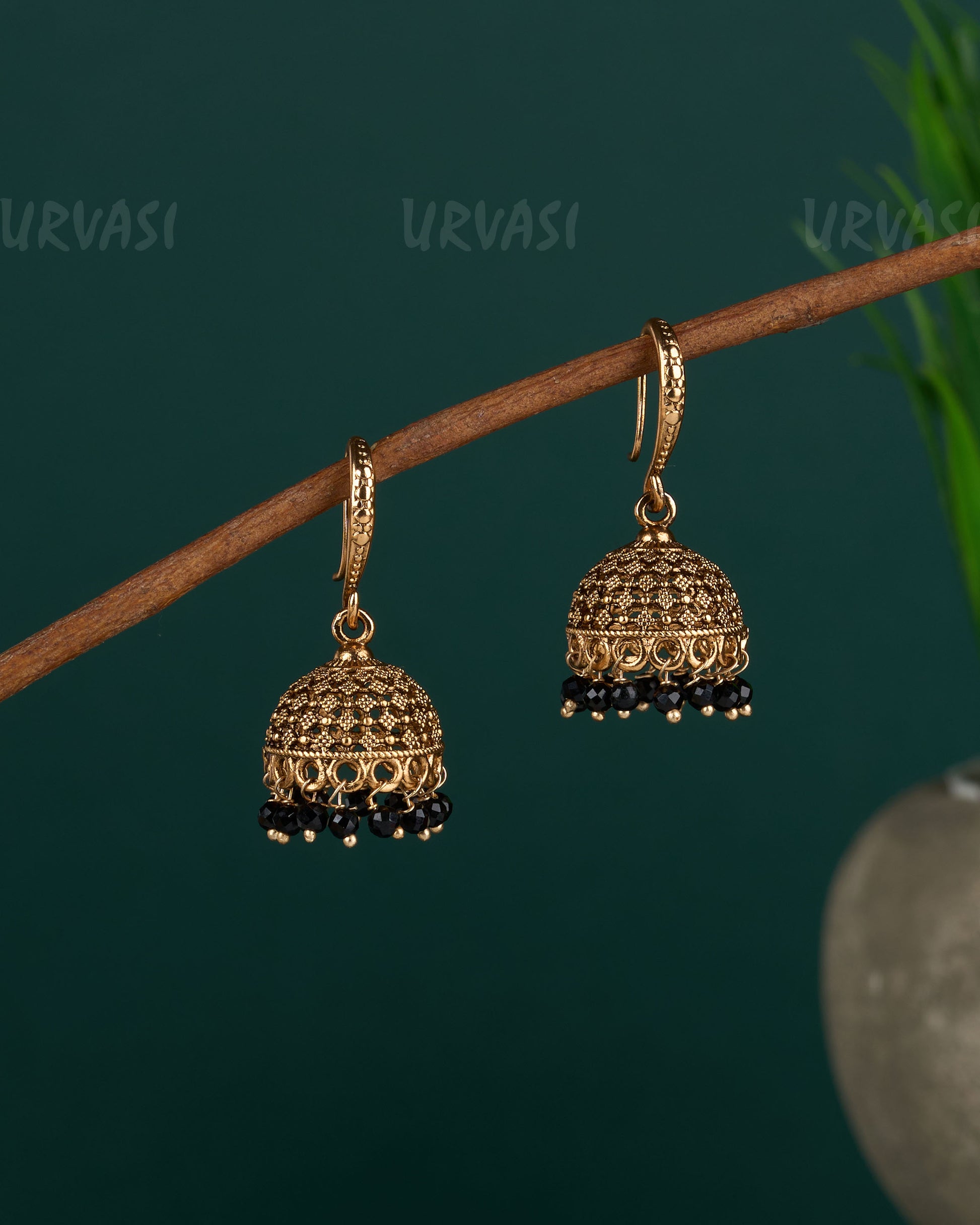 Elevate your ethnic style with these timeless gold-toned hanging jhumka earrings. Featuring a classic jhumka design, they offer graceful movement and a subtle shimmer that enhances any outfit, making them perfect for both festive and everyday occasions.