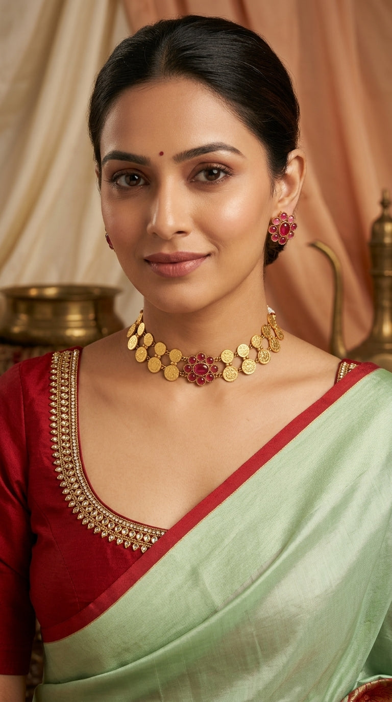 Add a touch of timeless South Indian elegance to your jewelry collection with this beautifully crafted Gold-Toned Kaasu-Floral Necklace. Inspired by traditional temple jewelry, this necklace features a stunning combination of classic kaasu (coin) motifs and delicate floral patterns, creating a rich and graceful design.