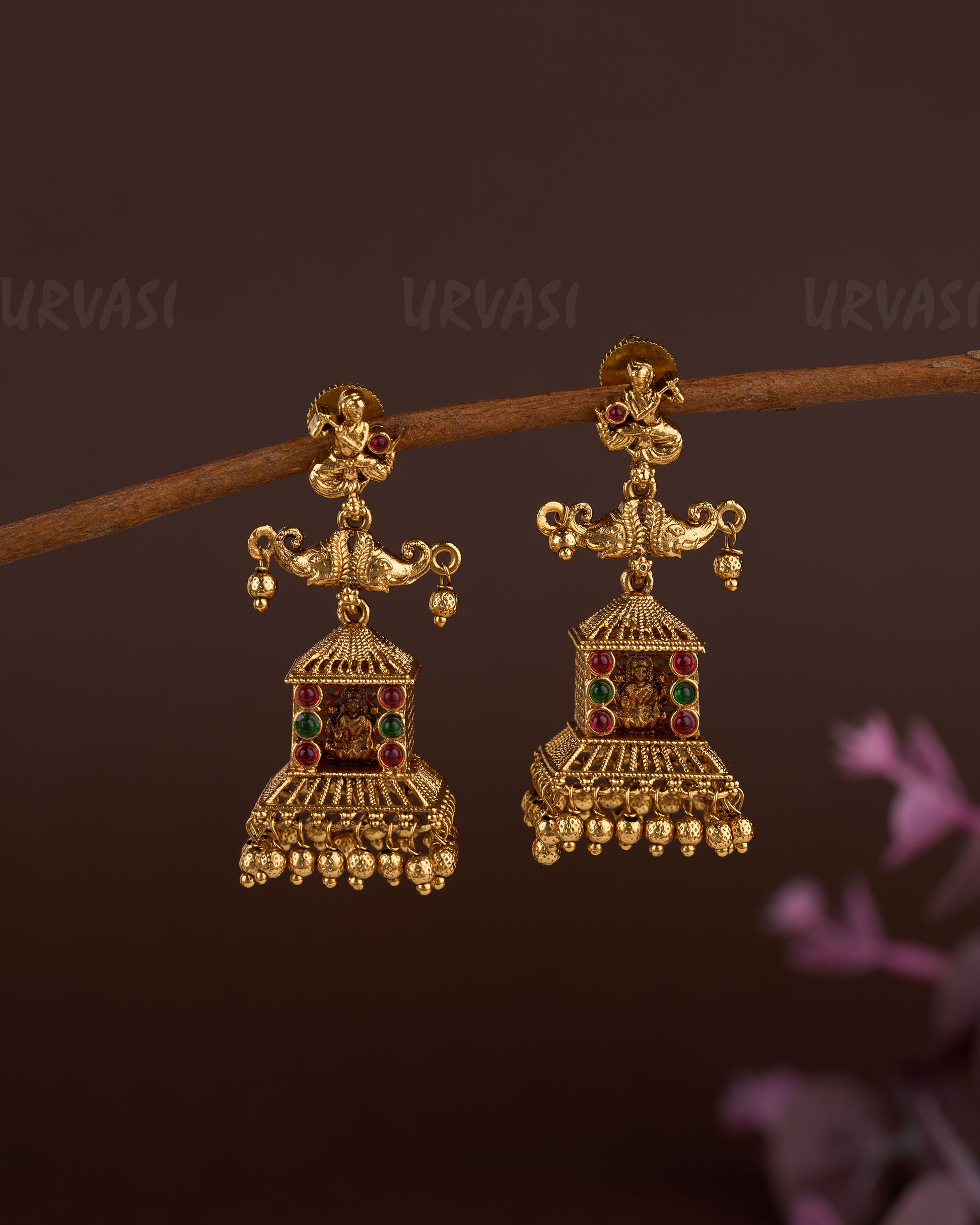 Expertly crafted with fine detailing, the design blends temple-inspired artistry with a radiant gold-toned finish for a regal and festive appeal. The elegant drop style adds graceful movement, making them perfect for weddings, religious ceremonies, festivals, and special celebrations.