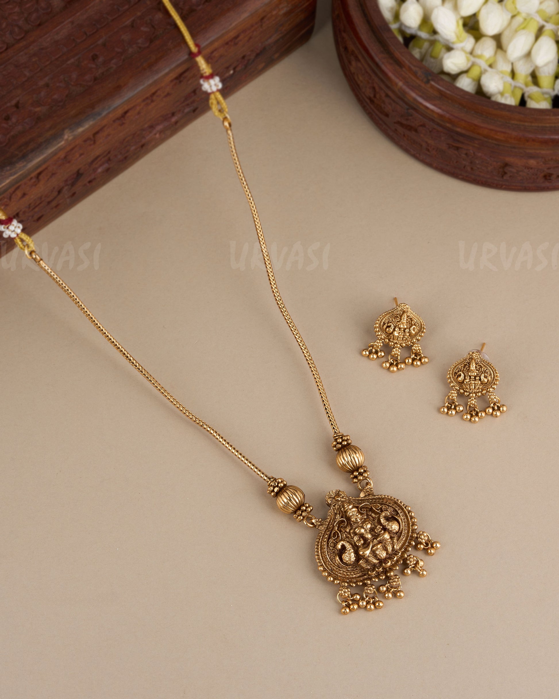 The pendant showcases intricate carvings and a radiant gold-toned finish, creating a classic and graceful look. Designed to complement ethnic outfits, this necklace pairs perfectly with sarees, lehengas, and traditional attire, making it an ideal accessory for weddings, festivals, and special celebrations.