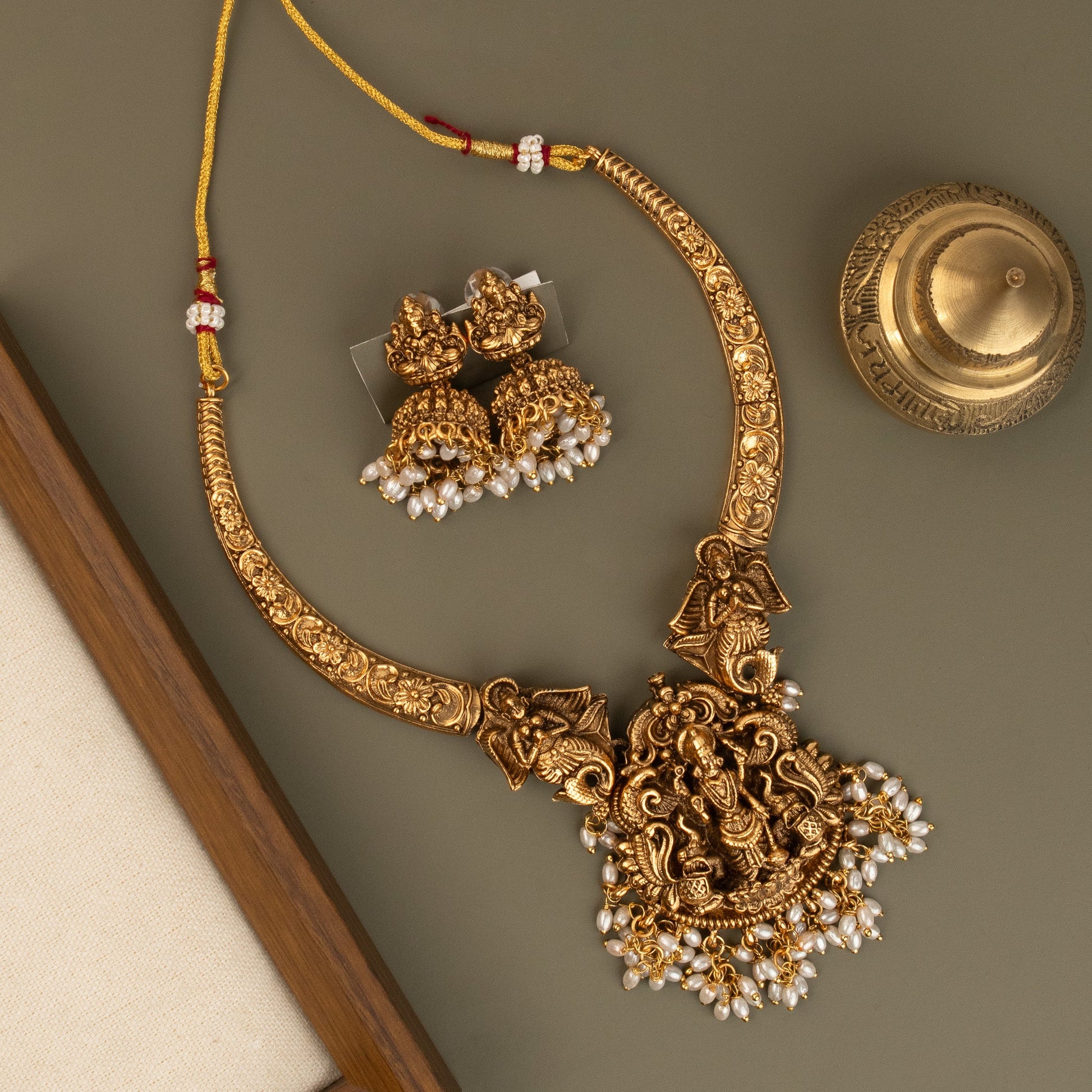 The intricate craftsmanship highlights every detail of the Lakshmi motif, enhanced by an antique gold-toned finish that lends a regal and heritage-inspired appeal. Perfect for weddings, festive occasions, and religious ceremonies, this necklace adds a spiritual and sophisticated touch to your ethnic ensemble.