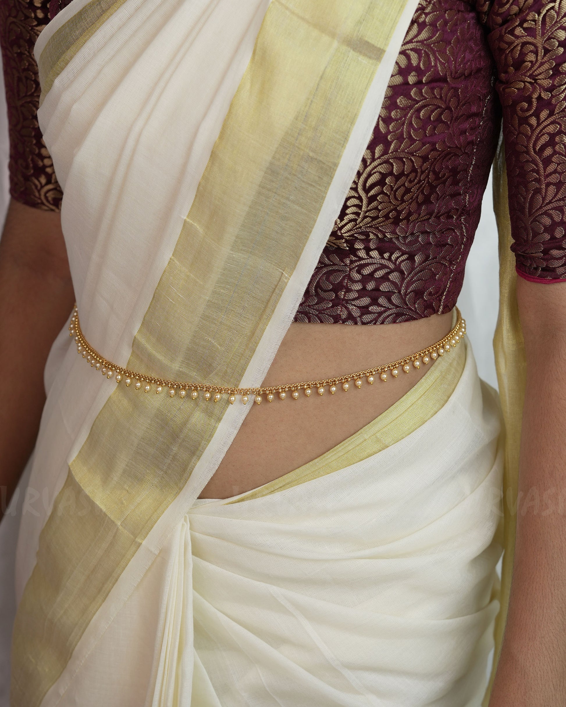 Add a touch of regal elegance to your traditional ensemble with this stunning Gold-Toned White Pearl Hanging Hip Chain. Crafted with a graceful combination of gold-toned metal and delicately suspended white pearls, this piece beautifully accentuates your waistline and brings a classic charm to any ethnic outfit.