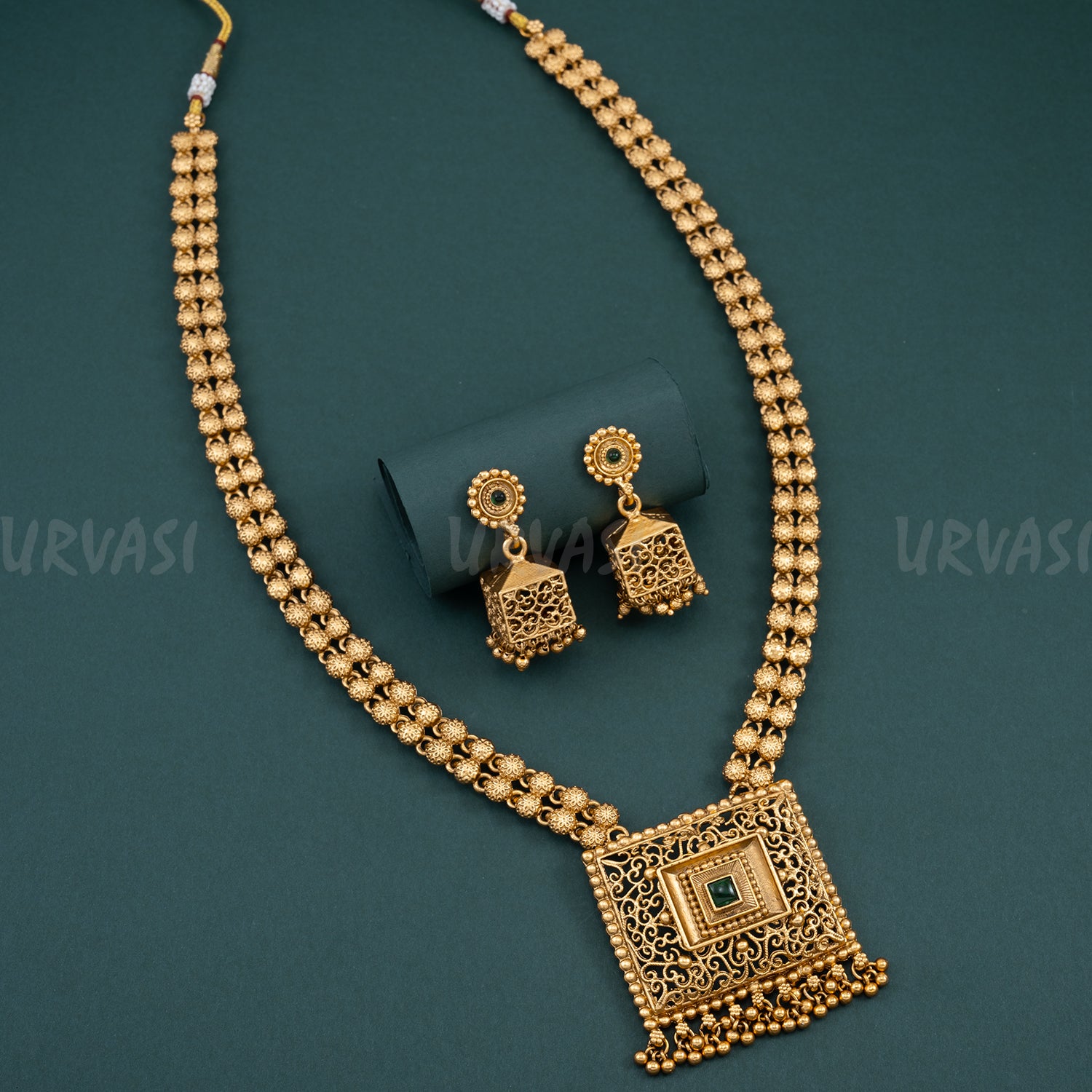 Channel the grandeur of royal heritage with this exquisite Mughal Square Pendant Long Haram Necklace. Inspired by the opulence of Mughal artistry, this necklace features a bold square pendant adorned with intricate patterns and antique detailing. Add a touch of boldness using the long haram necklace, which comes under our gold antique collection. You can make a statement with this versatile piece which is suitable for various occasions. Just grab your turn.