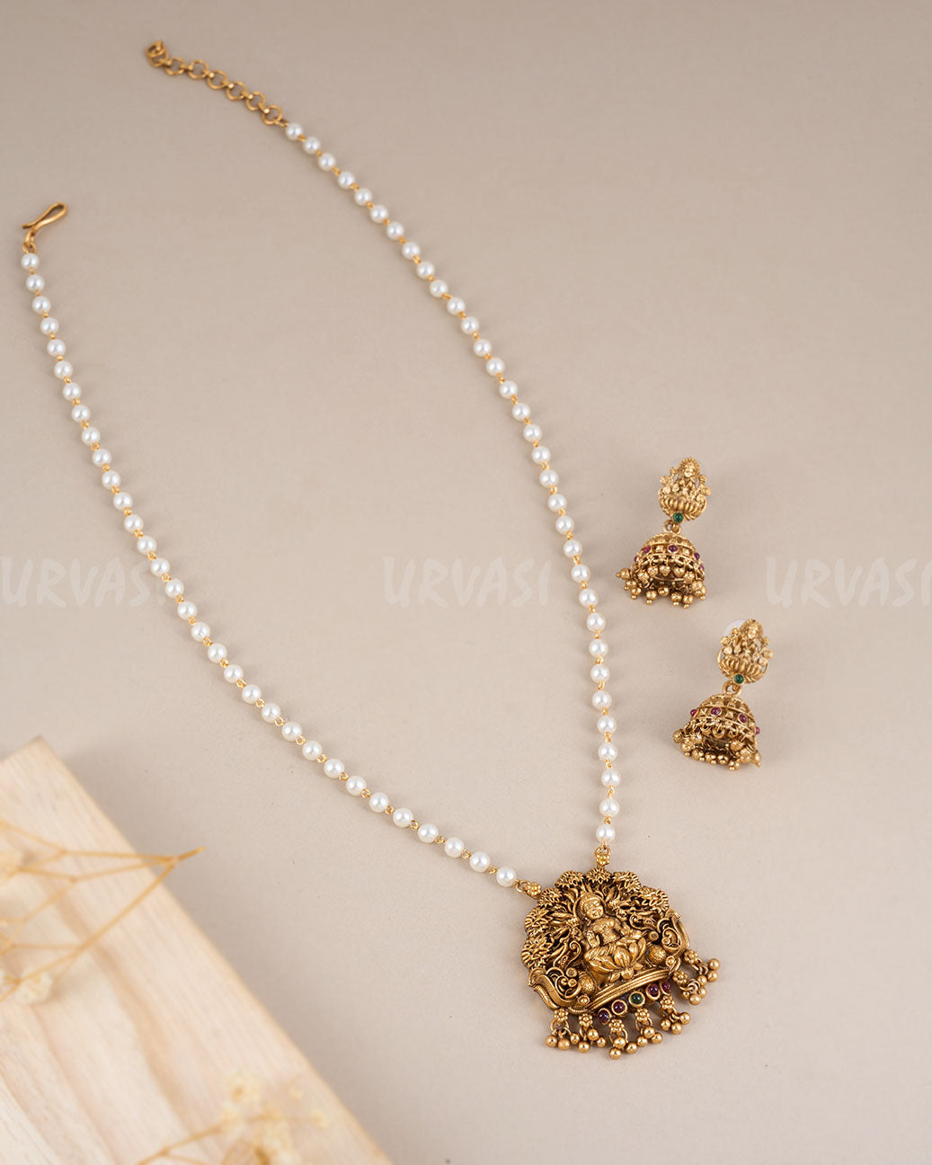 Embrace divine grace with the Lakshmi Pendant Pearl Long Necklace, featuring a beautifully crafted pendant of Goddess Lakshmi symbolizing prosperity and blessings. Strung with lustrous pearls, this long necklace blends spiritual significance with timeless elegance. Perfect for weddings, religious ceremonies, and festive occasions, it adds a graceful and auspicious touch to your ethnic collection.