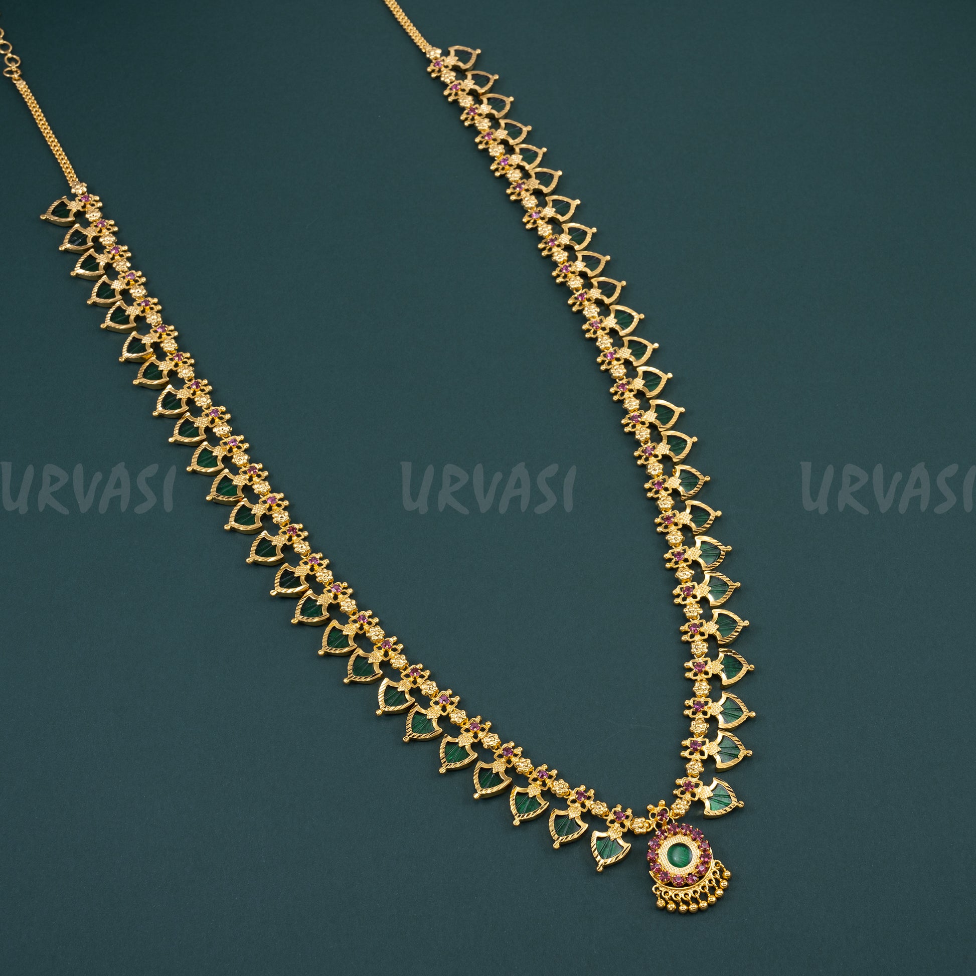 Long palakka necklaces often hang low, reaching down to the chest, which makes them a striking statement piece, especially when worn with traditional sprees and attires. A Palakka necklace is a popular choice during weddings, festivals and celebrations.