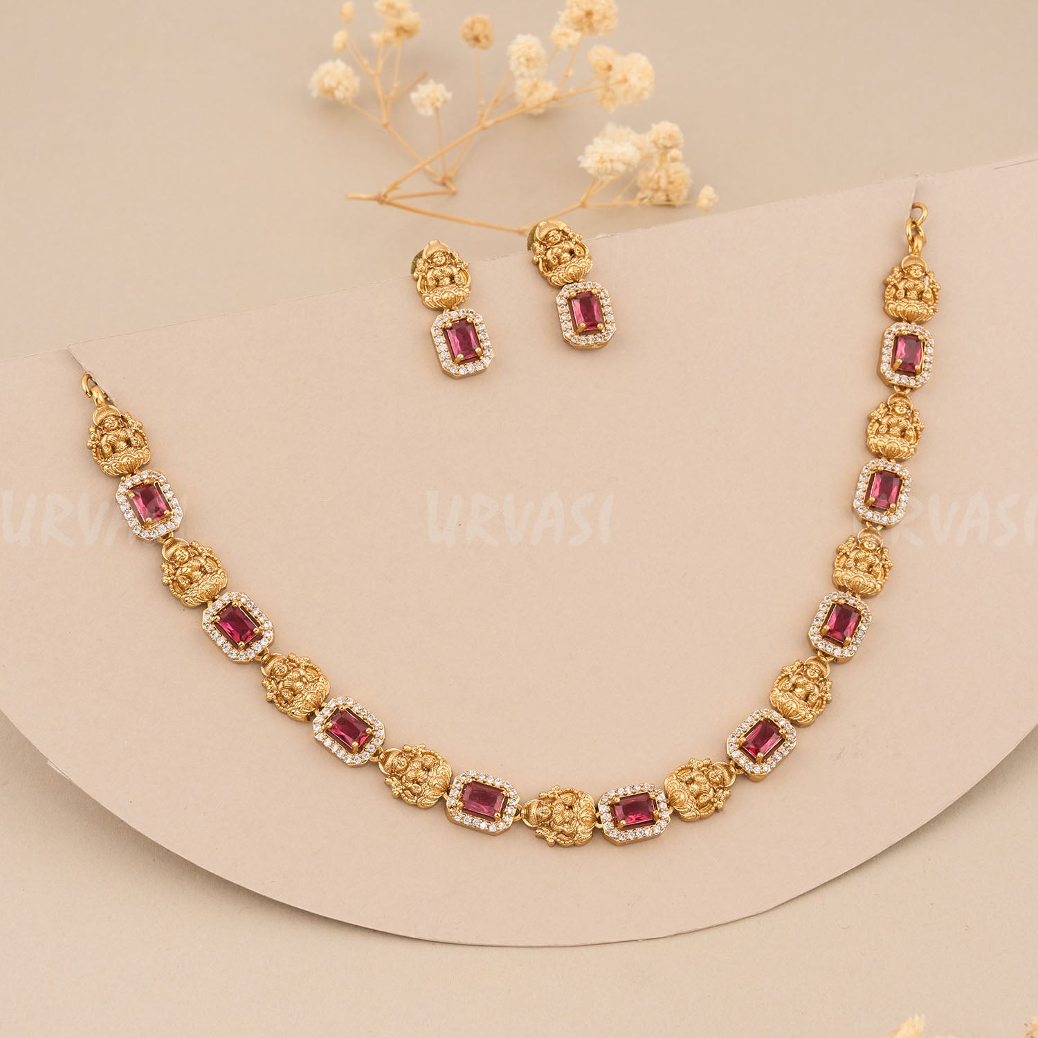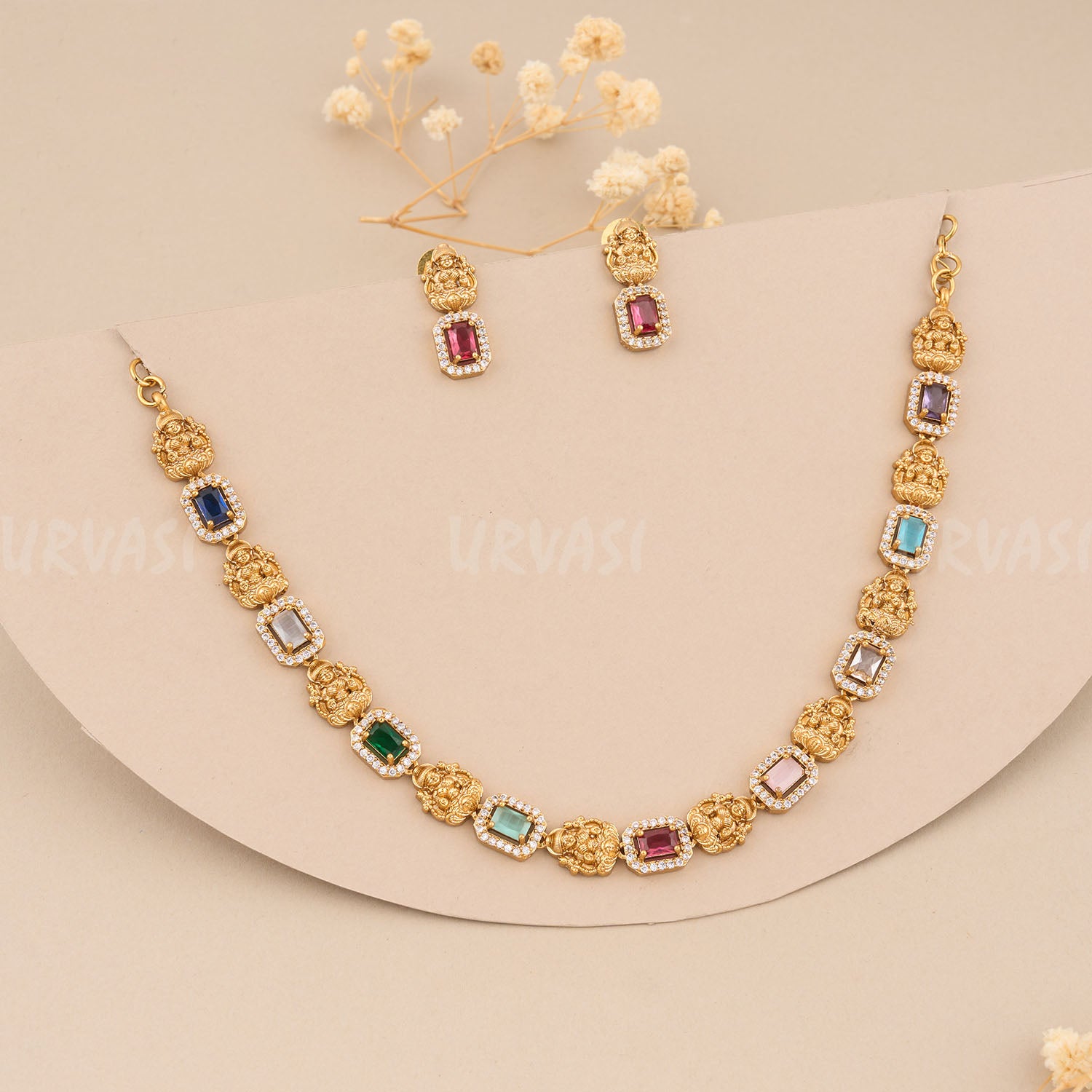 This necklace showcases Mahalakshmi as the prominent feature adored together with stones. It has got complimentary earrings similar to the necklace. This necklace can be worn to weddings, traditional and cultural celebrations.
