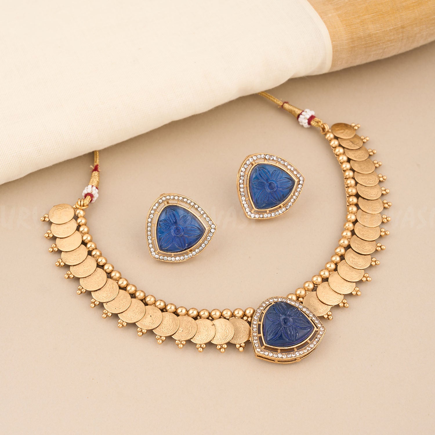 This stunning necklace set combines traditional charm with contemporary elegance. The necklace features a unique gold tone design with a row of textured coin shaped motifs, adding a rich heritage inspired appeal. The matching earrings replicate and ensure a harmonious and sophisticated look. This set is perfect for festive occasions.