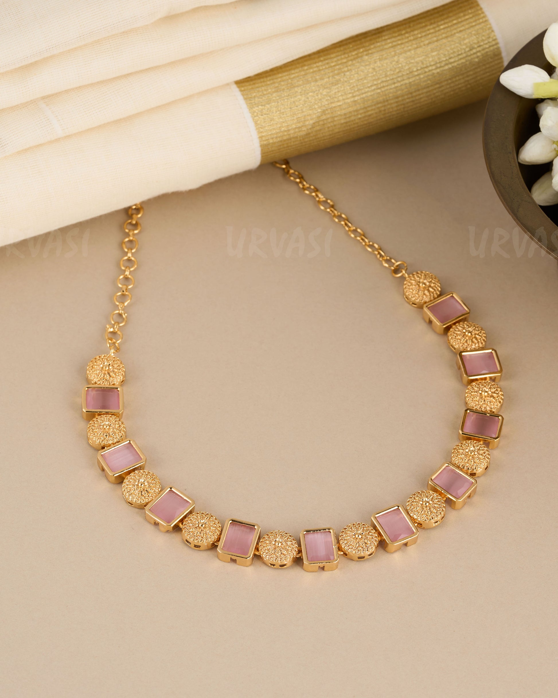 The soft pink stones evoke warmth and romance, while the floral design adds a touch of nature-inspired elegance, making it the perfect accessory for weddings, festive occasions, or enhancing your everyday ethnic wear. Lightweight and comfortable, this necklace effortlessly blends tradition with contemporary style.