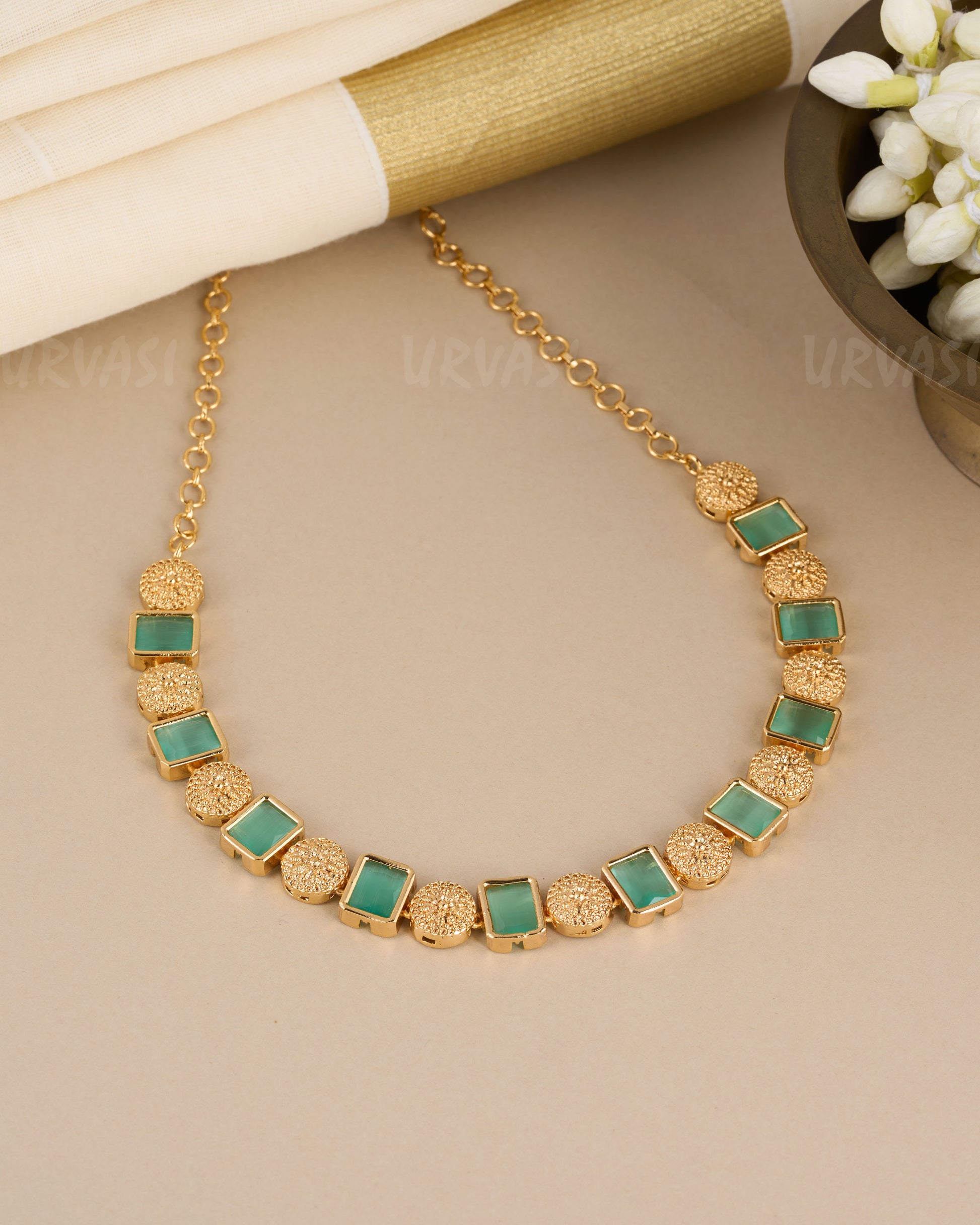 Infuse your look with a refreshing touch of elegance with the Gold Polish Mint Stone Necklace. Featuring cool mint-hued stones set against a radiant gold-polished base, this necklace strikes the perfect balance between subtlety and sophistication.