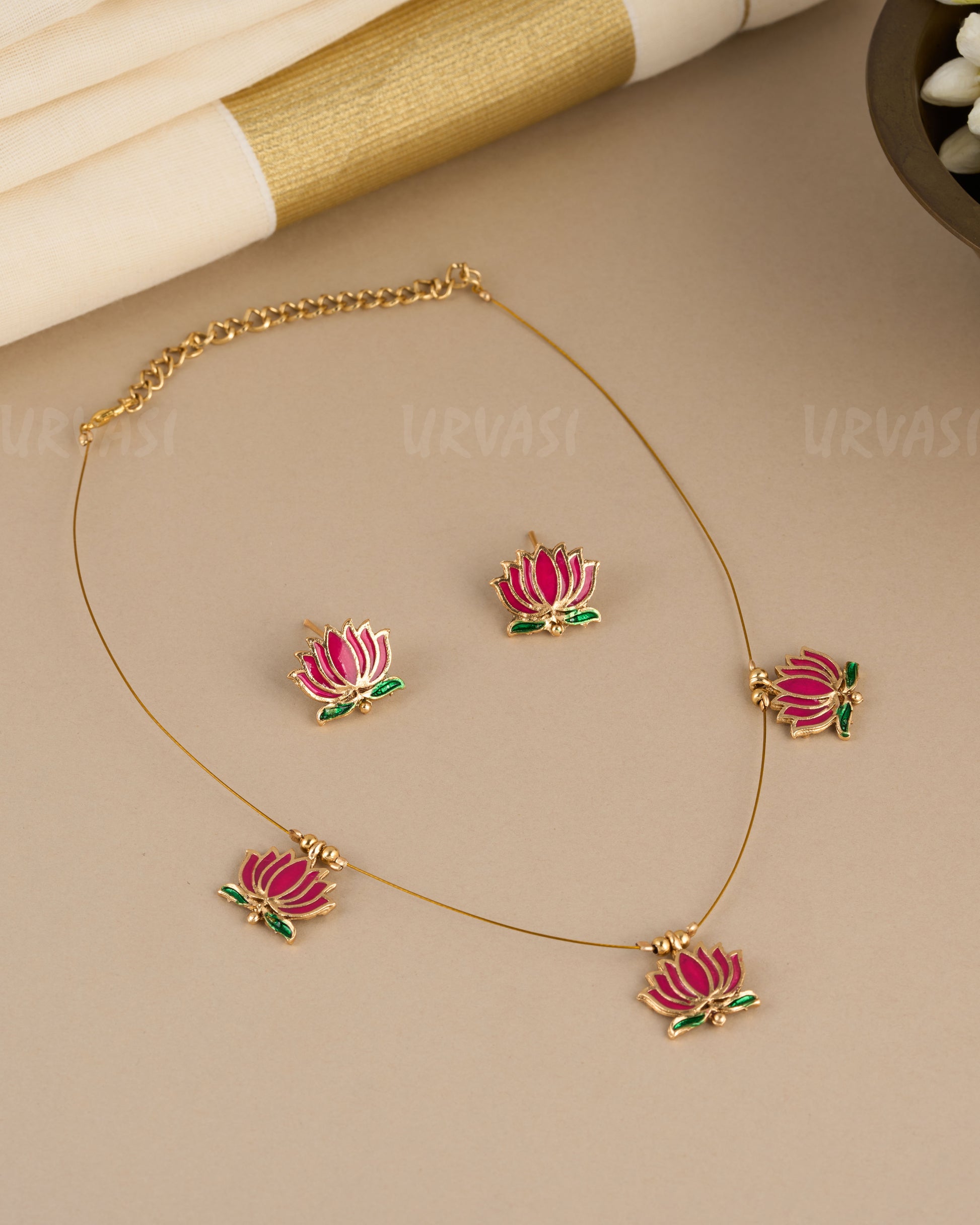 Celebrate timeless grace and understated beauty with the Manju Inspired Lotus Invisible Necklace, a delicate tribute to the iconic actress’s elegant style. This necklace features three exquisitely crafted lotus motifs, symbolizing purity and renewal, set in an invisible gold setting that creates a floating, seamless effect.