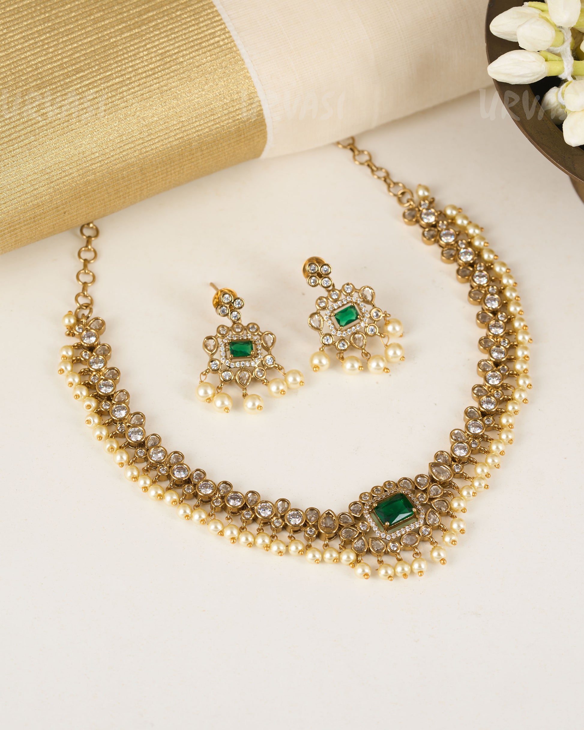 Crafted with precision, the necklace exudes sophistication — whether paired with traditional attire or styled as a statement piece with contemporary outfits. The natural allure of emerald tones combined with the classic elegance of pearls makes this necklace an essential addition to your jewelry collection.