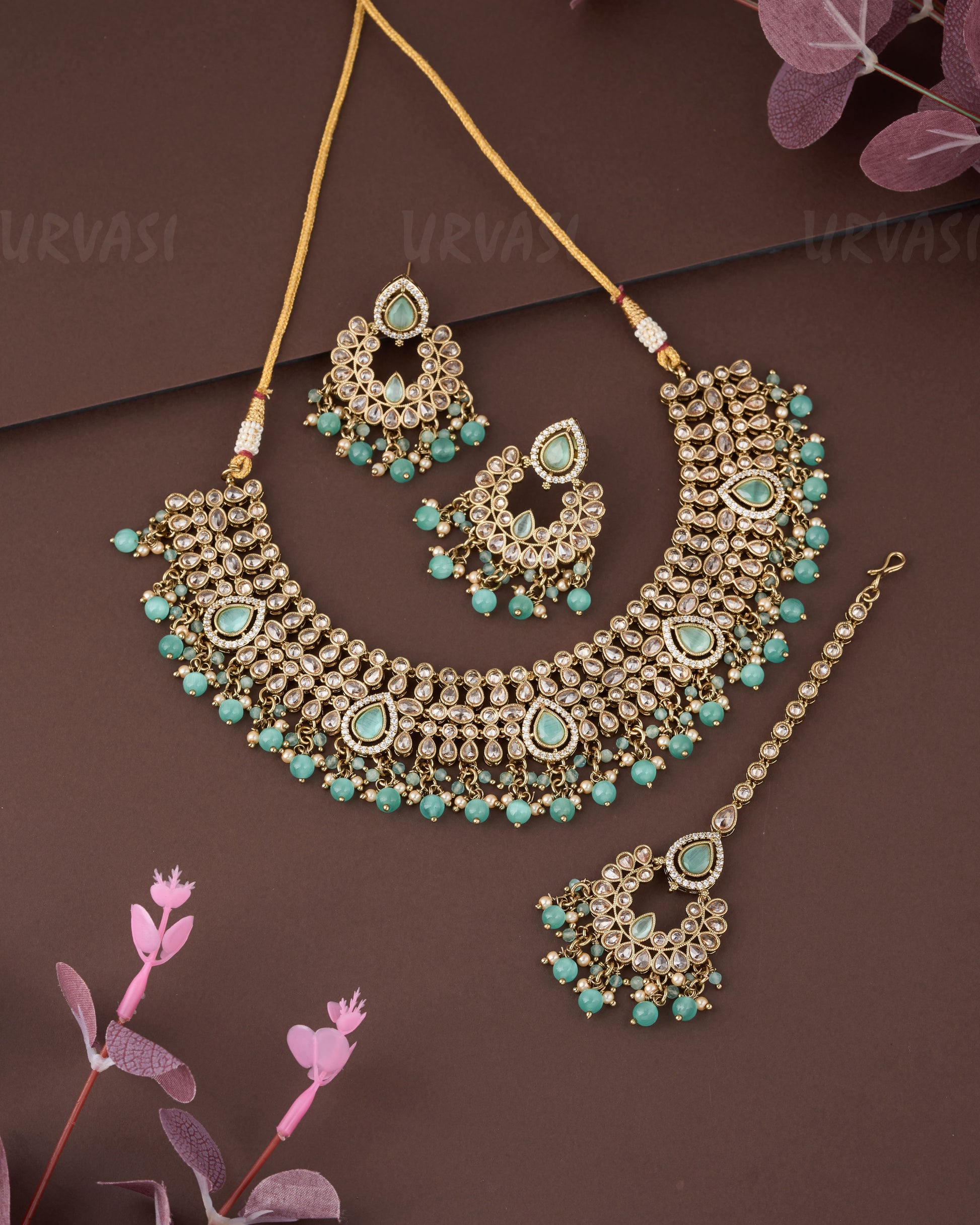 Crafted with intricate detailing and high-quality materials, the mehendi polish adds a rustic yet luxurious texture, enhancing the lush green stones’ brilliance. Ideal for weddings, festivals, or special ethnic occasions, this necklace brings an exquisite touch of heritage and sophistication to your ensemble.