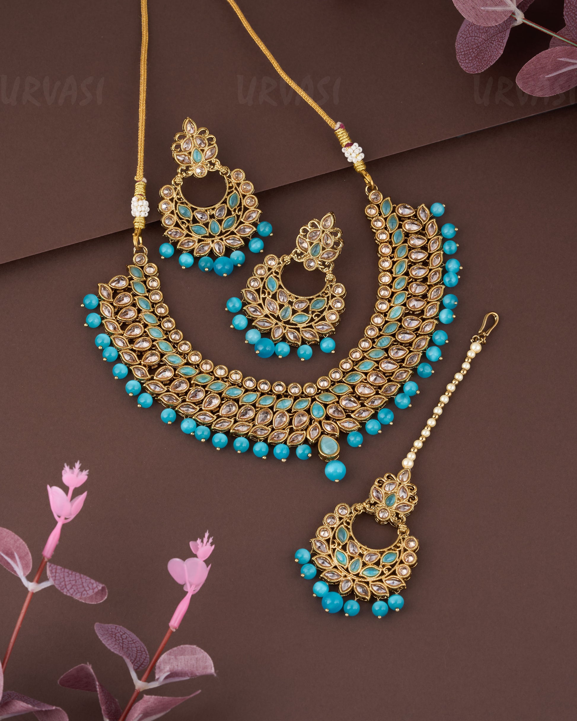 Make a striking statement with the Premium Sky Blue + Mehendi Polish Necklace, a masterpiece blending deep green stones and a unique mehendi (antique green-gold) polish finish. This necklace exudes vintage charm and royal elegance, perfect for those who appreciate traditional artistry with a modern twist.