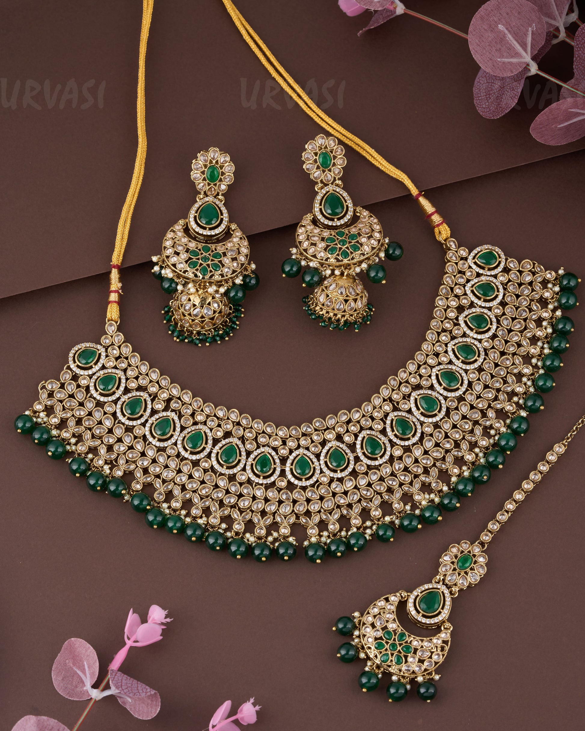 Crafted with intricate detailing and high-quality materials, the mehendi polish adds a rustic yet luxurious texture, enhancing the lush green stones’ brilliance. Ideal for weddings, festivals, or special ethnic occasions, this necklace brings an exquisite touch of heritage and sophistication to your ensemble.