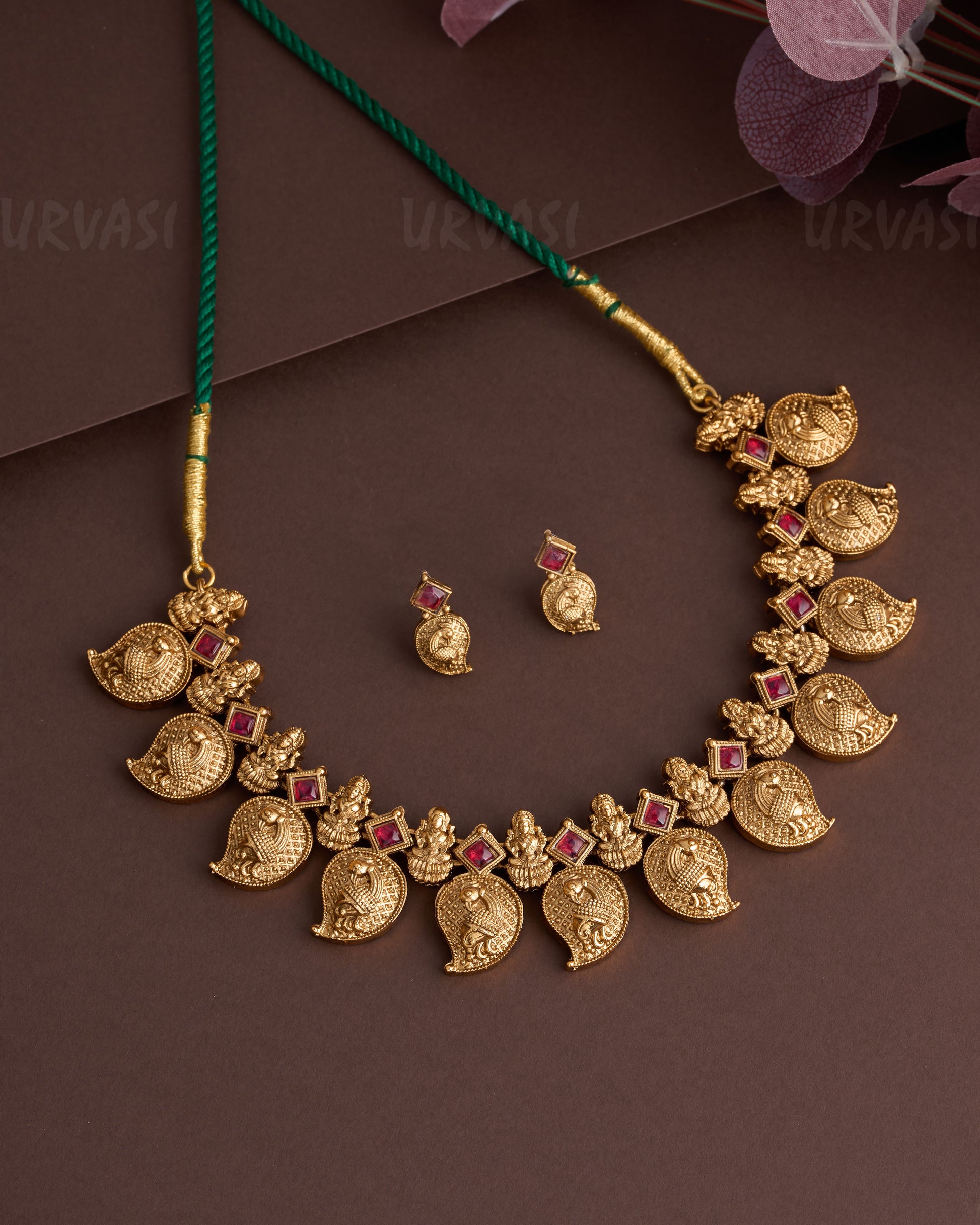 Adorned with sparkling ruby stones that add a royal touch, this necklace is perfect for weddings, festivals, and temple occasions. Crafted with fine gold polish and intricate craftsmanship, it brings together spirituality and elegance in one majestic piece.