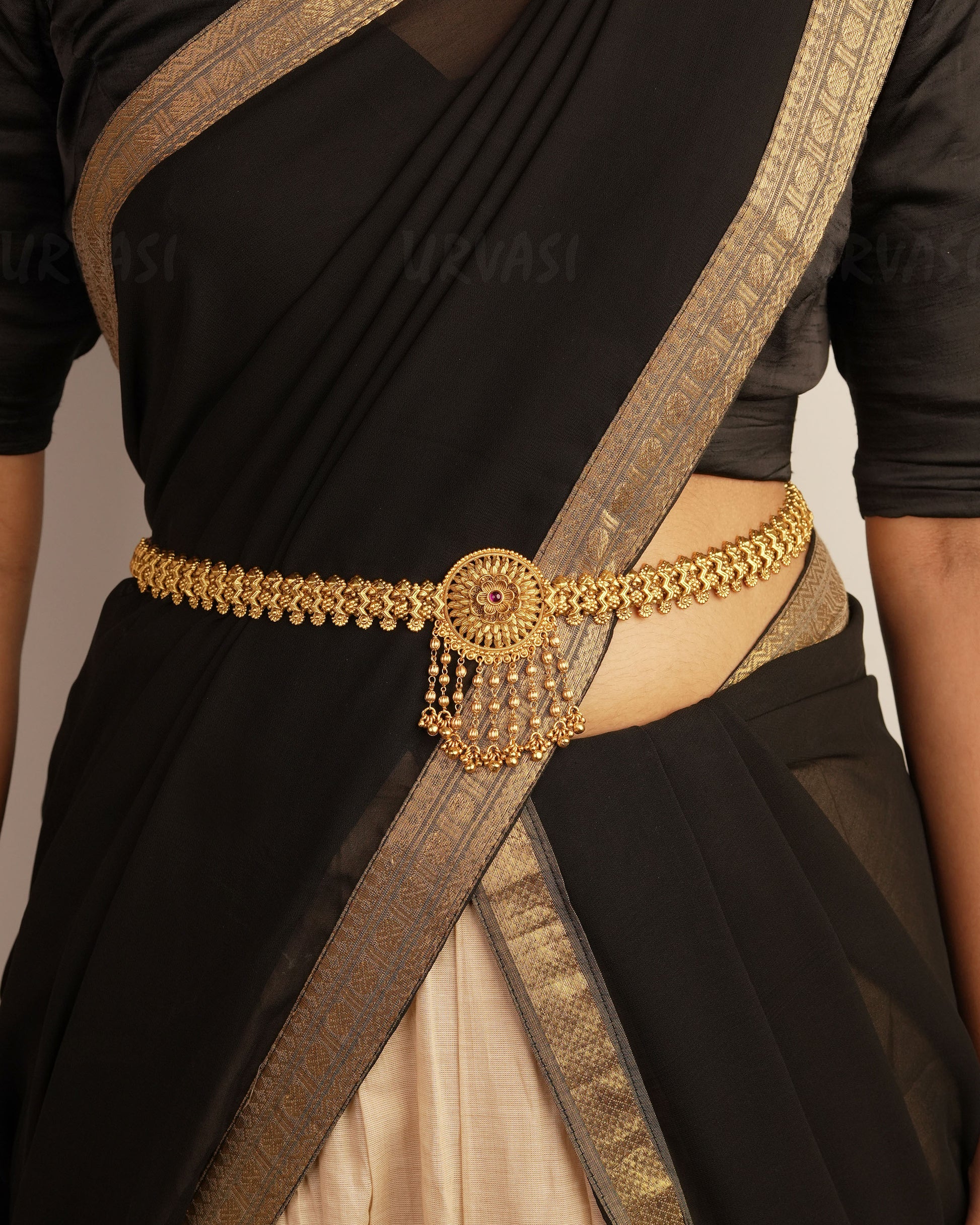 Elevate your ethnic look with this Premium Antique Hipchain, exquisitely designed to blend traditional charm with regal sophistication. At the heart of this masterpiece lies a striking ruby stone, set in the center, radiating rich hues of deep red – a timeless symbol of passion and royalty.