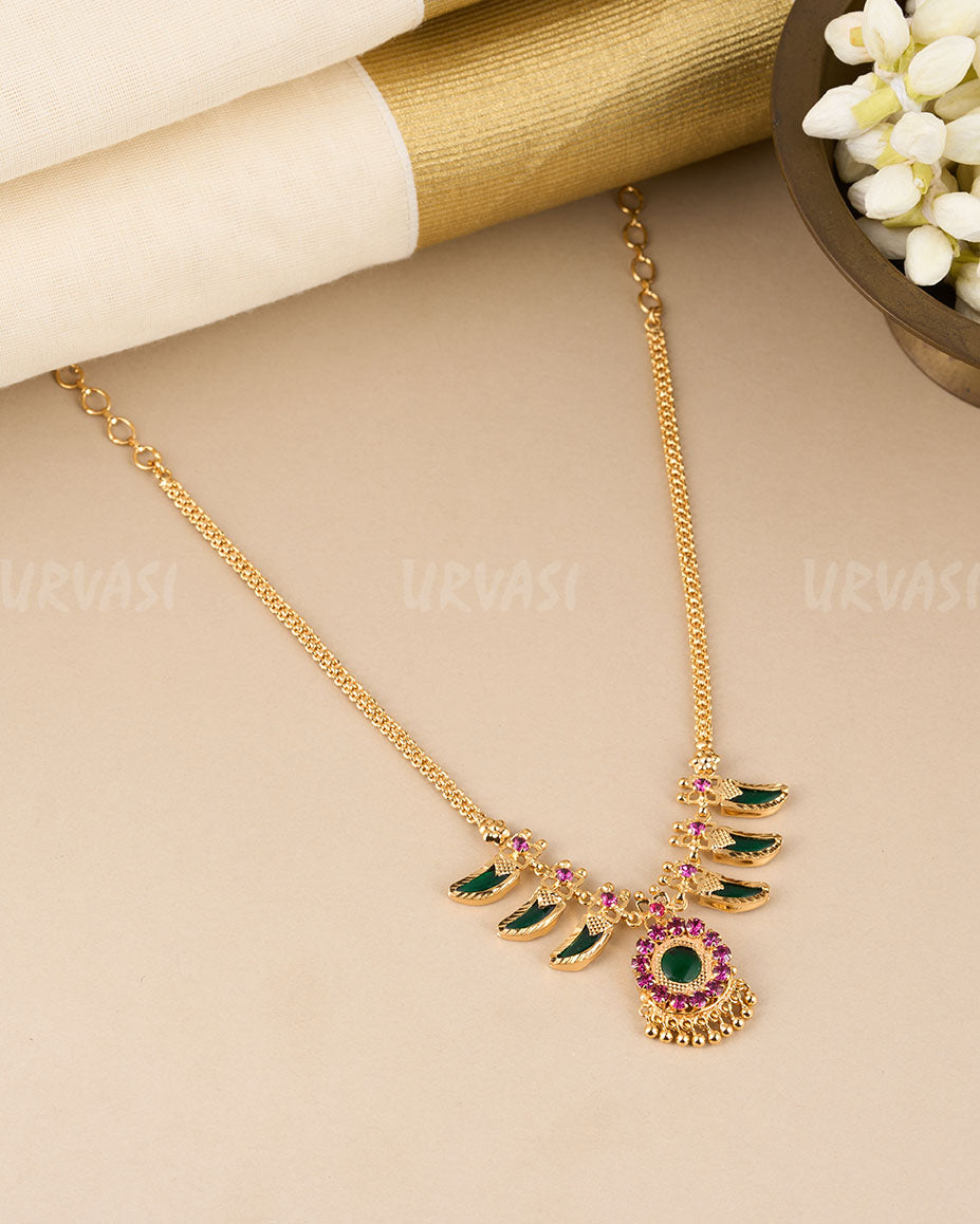 Adorned with vibrant stones and finished in antique gold plating, it offers a perfect balance of elegance and tradition. Lightweight and comfortable, the Pulinakham 3+3 Necklace is designed to enhance your ethnic attire with grace and sophistication.