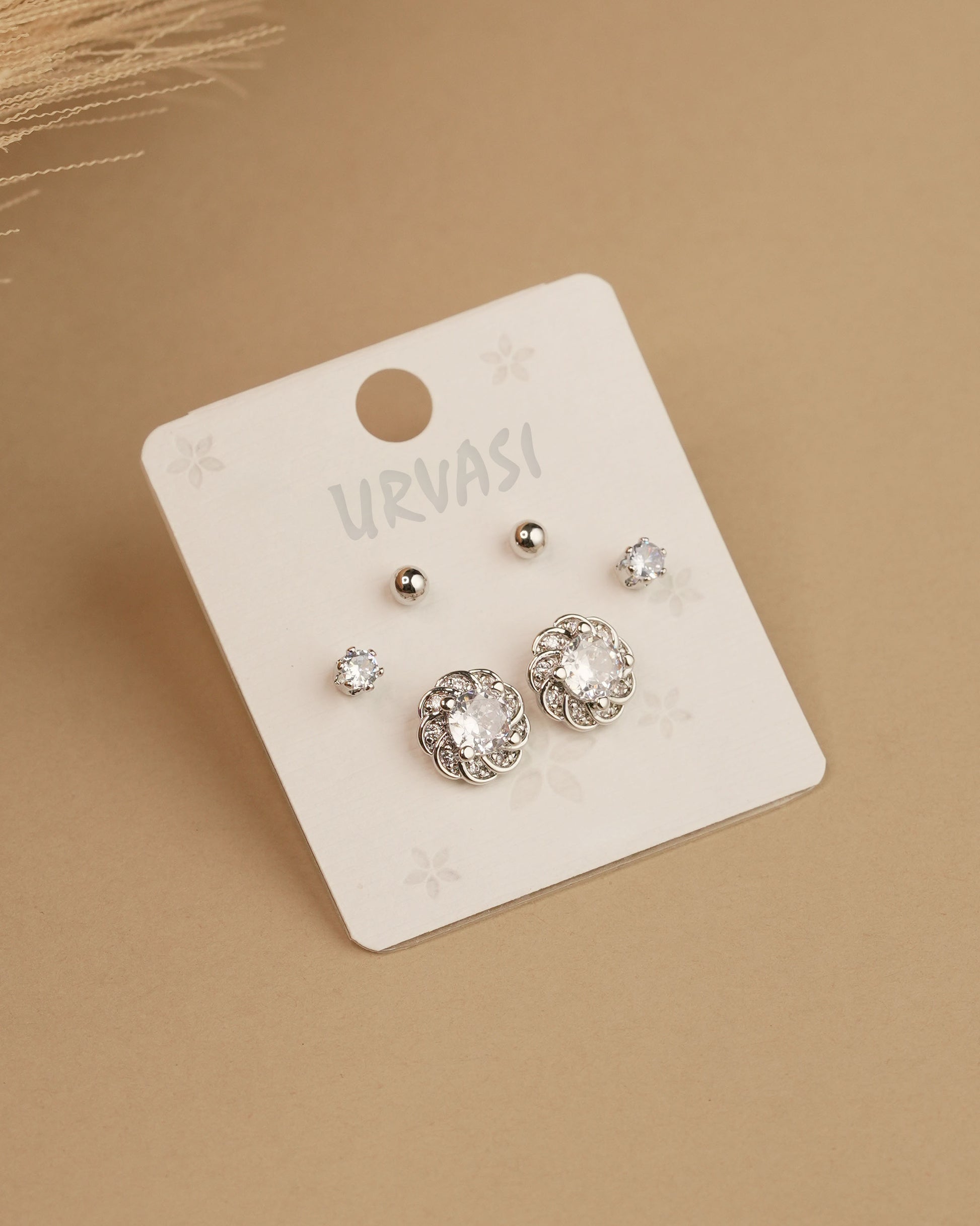 Add timeless elegance to your look with these Rhodium Polish Floral AD Earrings. Featuring a delicate flower motif and adorned with sparkling American Diamonds, these earrings shine brilliantly against a lustrous rhodium-polished base. Lightweight and versatile, they are perfect for daily wear, festive occasions, or parties.